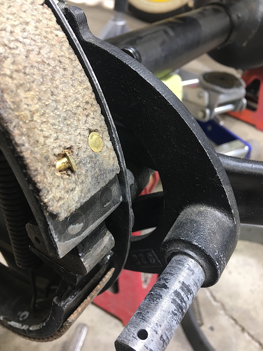 When looking at the rear emergency brake, I found several rivets that were bent and dragging on the drum. But i was more taken by the direction of the rivets. Instinctively I would have wanted to put the rivets in the other direction, with the head on the metal band side and the split rivet through the band material like is done on the transmission band. This way would seem to leave a lot of head to drag on the drum as time goes by. Obviously he didn’t sink the head at all, but even then, the other direction would seem right to me.