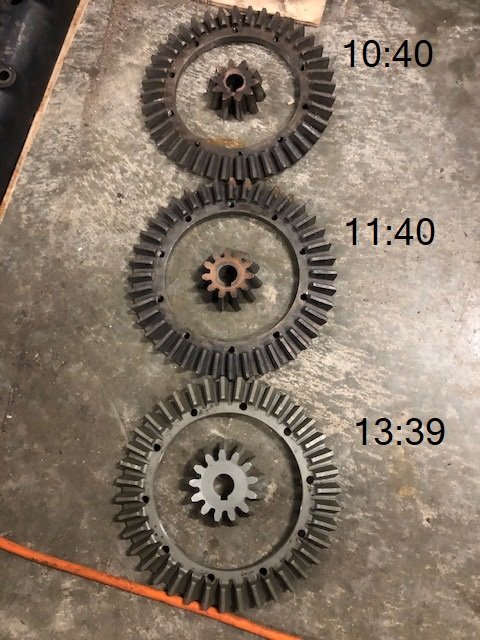 Just for your information, the picture shows a 10 tooth pinion and a 40 tooth crown gear, a 11 tooth pinion and 40 tooth crown gear, and finally a 13 tooth pinion and 39 tooth crown gear. The 13:39 is going into hay wagon to speedster project.