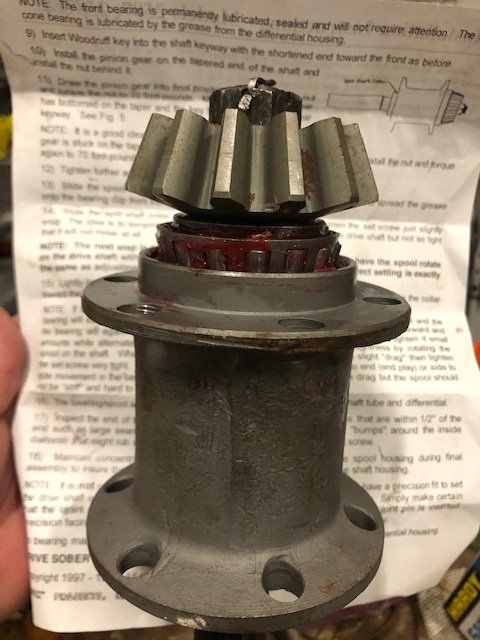 Done! The bearing was just slightly too tight or the shaft was slightly too large. The shaft measured 1.035 OD and the bearing measured about 1.0 to 0.998 ish so I had to do some tedious sanding to take off just a bit then tapped it on with a hammer. The hardest part was torquing it to 70 lbs then really torquing it to turn the castle nut to get the cotter pin through. Electric impacts are a god-send. Note the sexy 13 tooth pinion in the picture.
