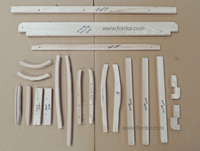 This is a '26-'27 pieces together touring, using some of the new metal pieces, they are formed different from Ford original, so you have to adapt wood pieces. On this front seat board (supports the bare spring seat cushion in the center- the rest of the seat spring rides on metal framing. You bolt that seat board to the frame, upright position as shown in photo.