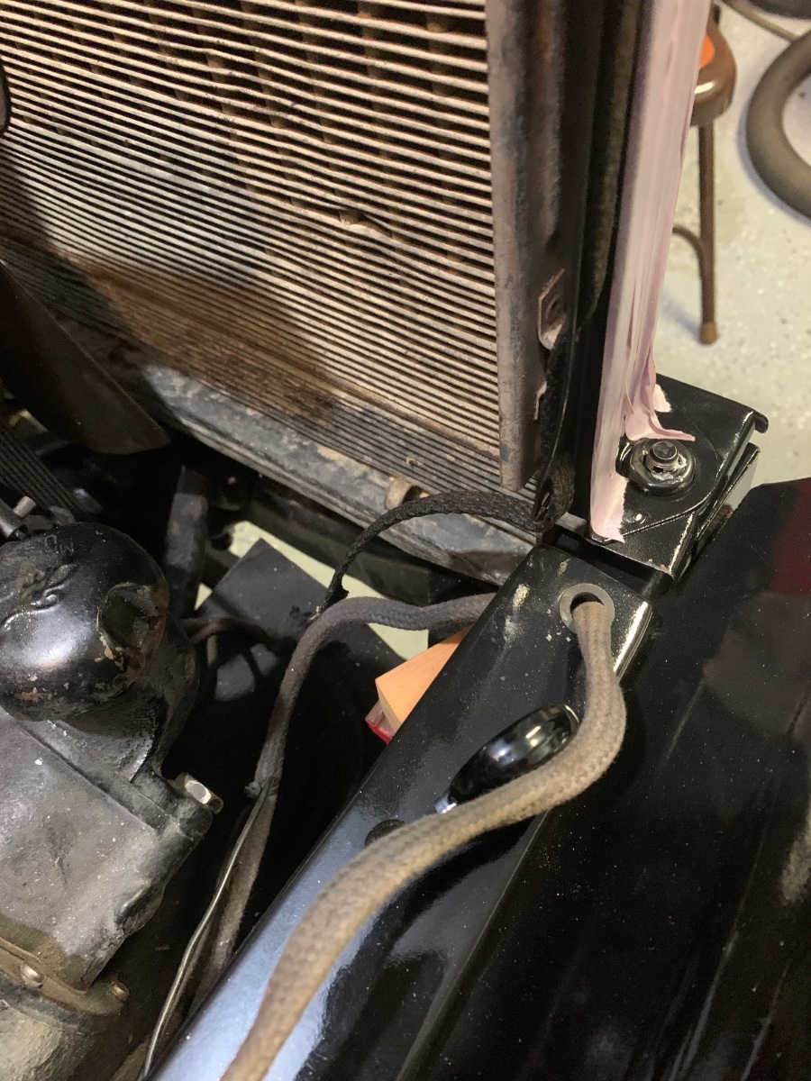 Ford Service photos of end of radiator shell lace, just trim the loose end short to hang just inside the shell behind the frame.