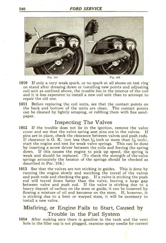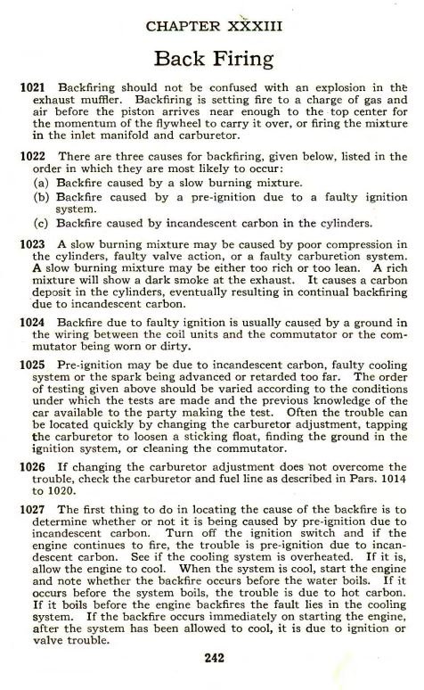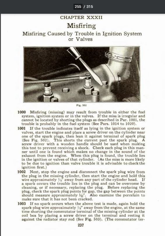 We missed the Christmas parade one year because we added more gas than Blackie's gas tank was used to having. The crud & rust from the tank stopped up the gas line. It varied in how long it took for the car to start starving for Gas. And back in those days, I just opened the carburetor drain valve and saw that it was dripping really slowly - not enough to keep the engine running. EPA might not think that was a good idea today. Sorry, I don't recall what year TT you have. So I posted a link to the 1925 Ford Service manual with the repair tips for running poorly located on page 237 see the link at: http://www.cimorelli.com/mtdl/servicemanual/default.htm ..