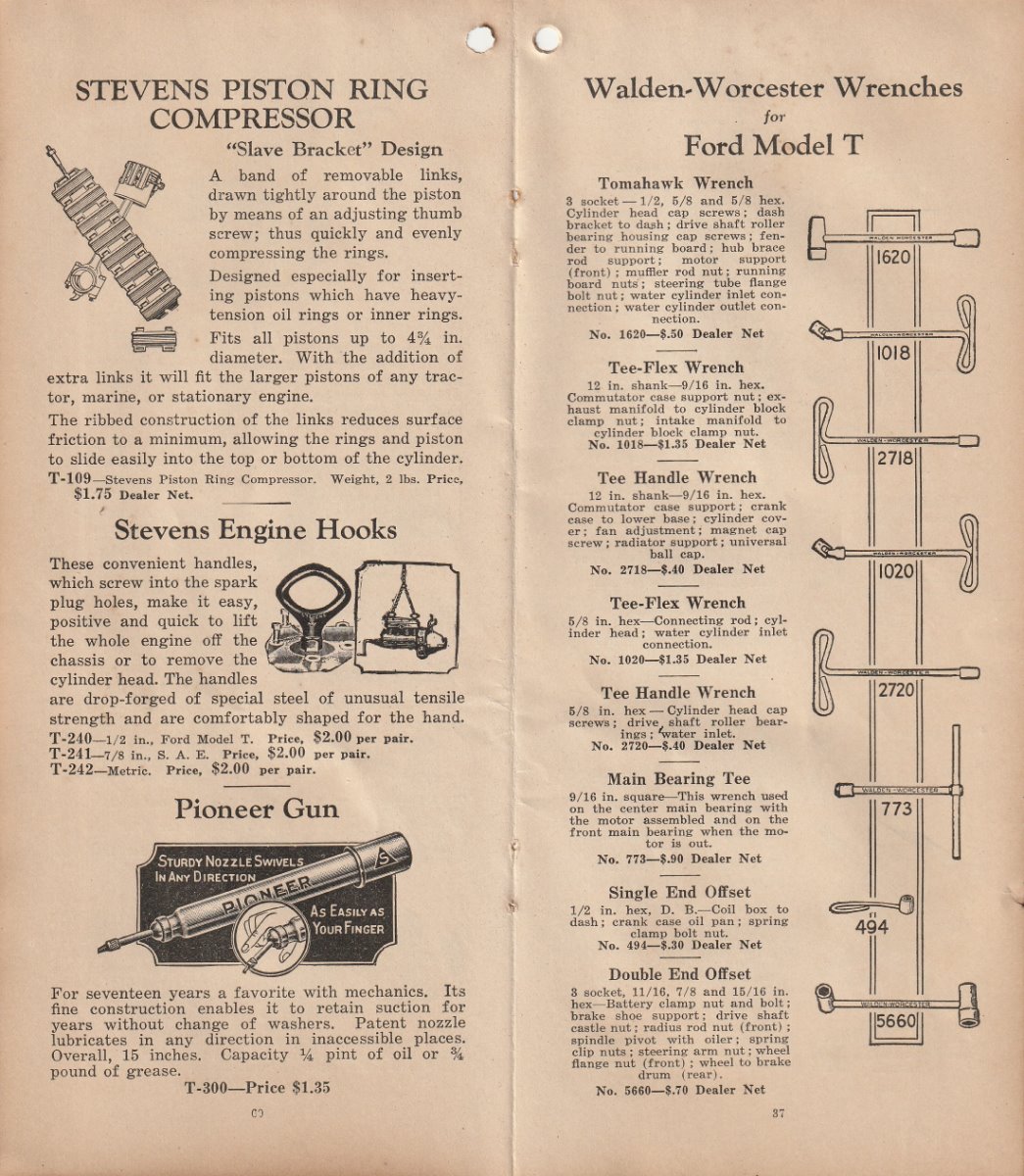 I finally acquired another Stevens catalog. They are very hard to find, and even harder to find one that is for sale. . It is what most folks consider the 1928 version. Stevens was bought out by Walden Worcester in late 1926. This is the catalog they put out after the buy out. It has most all the Stevens tools that were in the earlier catalog I re-printed several months ago,, and several tools that are in no other catalog that I know of. Most of them I have never seen in print before. I will post a few pic of some of the different tools. But I can not show all of them here. This catalog also has the Walden Worcester line of tools. Walden tools were not near the useable quality of the Stevens tools. Walden really stepped up their game when they acquired Stevens. Even though the Walden tools are not really as useful to us today, they are very collectable. This catalog will show what each Walden tool number is used for. There is also a small section of tools for the new Model A that just came out. There are a few pages of tools for Dodge, Chevy, Buick ect. It appears that Walden/Stevens was trying to widen their market in 1928. There is not much of the "other makes" tools. Most of the catalog will apply to our Model Ts. A lot of the Walden tools were considered to be useable on most all cars and trucks, so they are shown as "standard" tools even though they are some of the the same tools shown in the Model T section. This catalog is a very good reference for taking to a swap meet. The catalog is about 4 by 8-1/2 inch and has 96 pages not counting the covers.