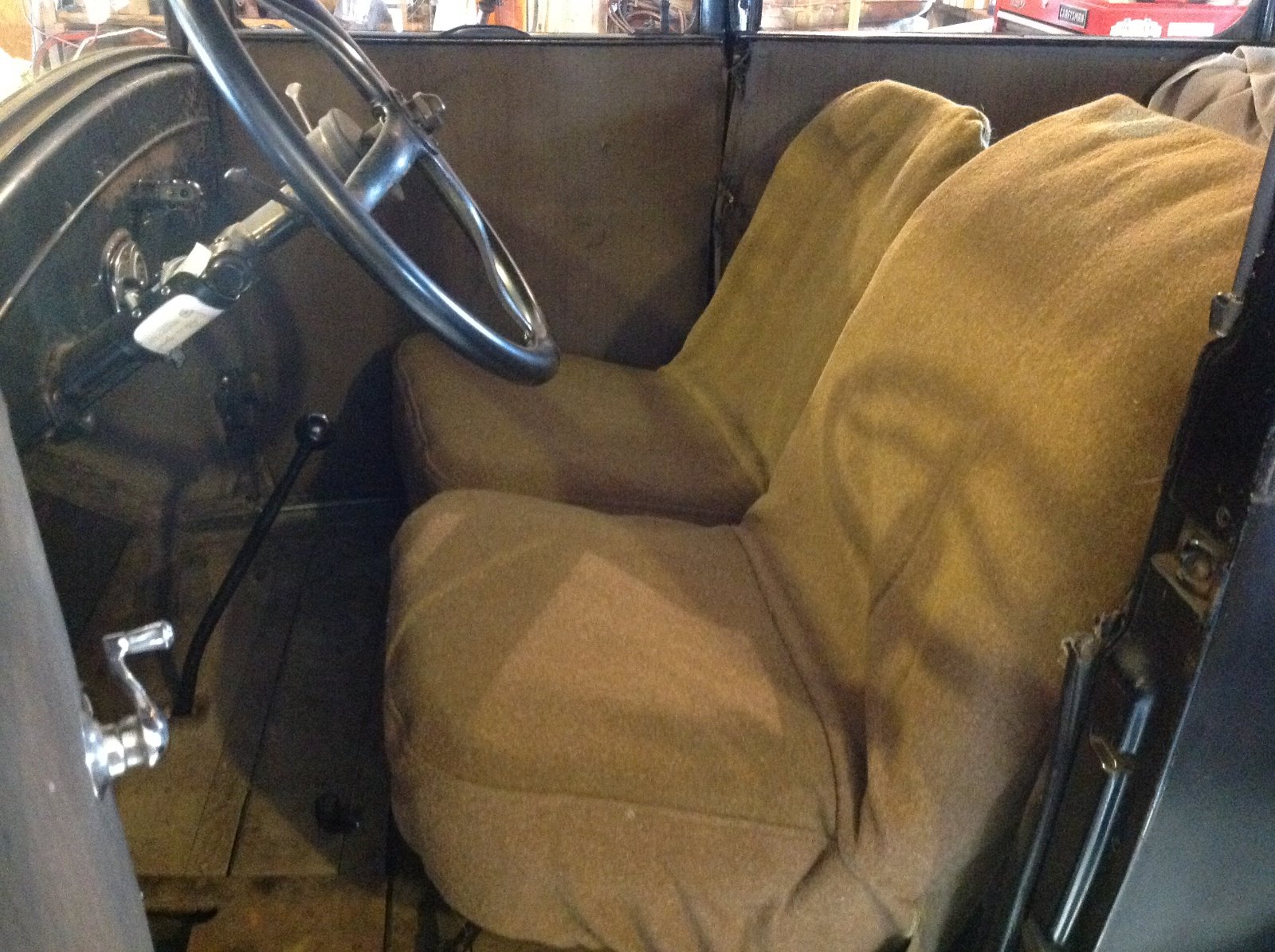 Okay guys and ladies too, don't want to discriminate, I am STILL searching for some kind of slip cover or something that isn't $500 plus to cover the bench seat in my 26 Coupe. I get it, most of the cars owners on here have multiple cars and deep bank accounts, but that isn't me. Just getting my car mostly mechanically sound has cost far over what I really had budget for and I still have a few things to go in that arena, so I still hope "someone" knows where I could buy some slip covers that could work on my small bench seat without to much "excess" material since the bench and back are so much shorter and smaller than a today's car bench slip cover. I have tried several auto stores(Pep Boys, NAPA, Autozone, and Advanced Auto) with no luck. I can't possibly be the only one that would like to "re-cover" their seats in their T fairly reasonably. I don't have a sewing machine and sewing on a button is about all the skill set I have with needle and thread, maybe a small rip, but that's about it. The "kits" from the vendors is far over my budget, plus I don't need to replace the entire interior of my car since except for the seats, the headliner and door panels are in fairly good shape, just a stain here or there which with more cleaning, I will be happy with. ANYBODY with HELP PLEASE??? Thanks for your reading time and hopeful help !!! Walt Wise