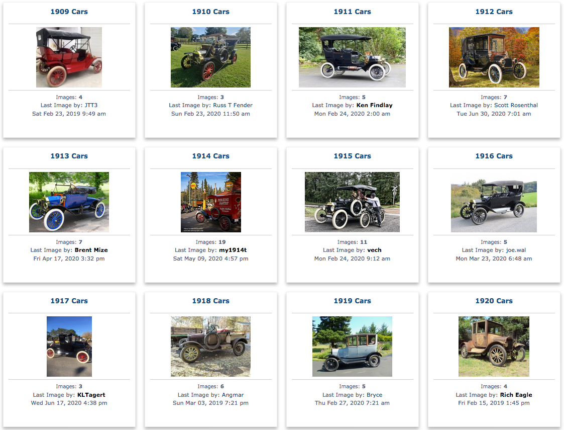 I just revisited the gallery and was both impressed by the good pictures and disappointed that there are so few of them. For some years there are only three or four pictures. I know there are a lot more than three 1917 Fords in this club, a lot more than four 1920, etc. Probably even more than ten 1915. Why not get the old flivver out in the daylight, shoot a nice photo of it, and add it to the gallery for everybody to enjoy?