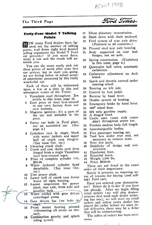 Let it be noted, that when the Model T was introduced in 1908 (15 October) Henry's ad department listed 44 Model T Talking Points. Two points on cooling included that the engine was cooled by a gear driven centrifugal pump and a gear driven Fan. Meaning that there were no belts to slip.