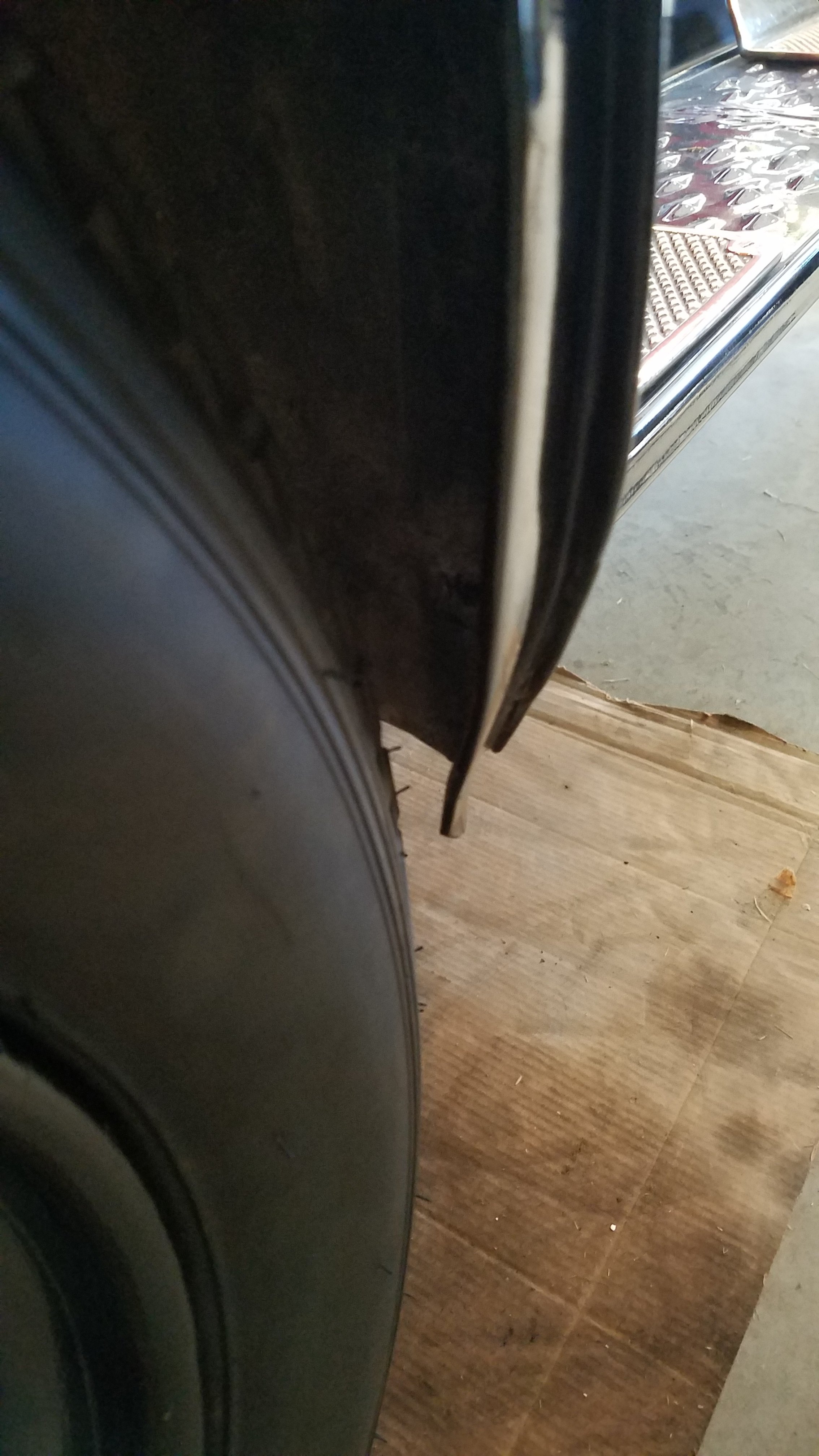 Normal clearance is tight in that spot. If the rear end is slid over a quarter of an inch to the right, and the running board bracket is pulling the running board in to the left another less than half inch? the compounded error is enough to cause the tire and fender to collide. Remember, that rear spring's sagging or poor quality re-arching can also shift the rear end sideways a bit. Another one many people never look at, is if one side the spring perch is frozen in place, it with throw off the axle centering properly.