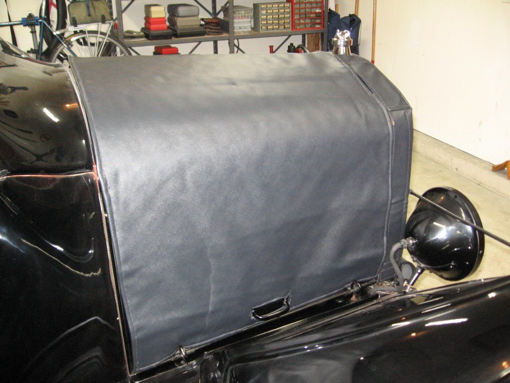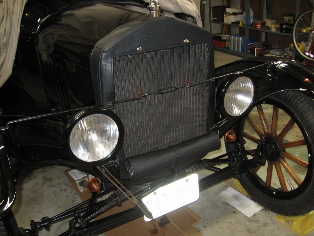 I pulled Betsy's winter front and hood blanket out of storage and installed them on the car today. A little early, but the winter front flap exposes the entire radiator opening when it's rolled up, so theoretically it could stay on year round. The camera flash makes the vinyl look gray, but it is black to the naked eye.