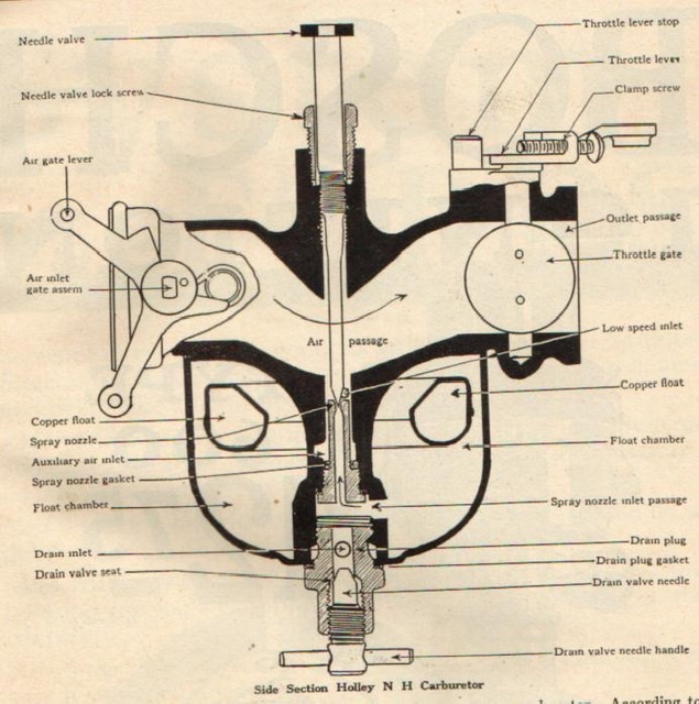 Now to check the fuel. Before you install the spark plugs, put a few drops of crankcase oil in each cylinder and rotate the engine a few turns. Then put the spark plugs back in. With the parking brake set, and a chock block in front of one of the wheels. Be sure the gas valve on the sediment bulb and if there is another valve near the carburetor both valves should be open and there should be at least a couple gallons of gas in the tank. Turn the needle valve on the carburetor gently clockwise until it stops turning. Note, do not turn it down hard or you could damage the valve. Now back the valve counter clock wise about 1 1/2 turn. Be sure the spark lever is all the way retarded, that is in the up position. The accelerator lever should be down about 1/4 way on the quadrant. Crank the engine over a few times with the choke pulled. If you pull the crank more than 3 or 4 cylinders it will cause gas to start dripping under the carburetor. this indicates a flooded condition, but you will be sure the gas is flowing through the carburetor and there is enough vacuum to suck gas into the cylinders. You might want to crank a few pulls without the choke to clear it if it is flooded. Now turn on the key and try to crank start. Always pull up on the crank, do not put the thumb around the crank handle and when you reach the top, pull your hand and arm up away from the crank. If it won't start with the crank, you can tow the car. Put a tow strap around the frame or if you cannot get it around the frame, attach to the front spring. but not to the axle. You don't want to bend the axle or pull the ball joint out of the socket in back of the engine. Pull in neutral When you get up to about 15 MPH with the key on, let the clutch out into high gear. The engine might start if you are lucky. If it starts, pull down the spark lever and turn the needle on the carburetor to find the smoothest spot. If you turn it clockwise it will lean the mixture and the engine will start to sputter, back it off until it runs smoothly, If you turn the valve counter clockwise, it will enrich the mixture and start to lope. Find the spot between those two points where it runs most smoothly. Usually, if you start the engine often, it will start right up with the crank. Always remember to retard the spark before cranking. On some cars if you are trying to start it on magneto, you will need to pull the spark down a notch or two to get it to spark with the crank, but I would advise you to try with it all the way up, and if you don't get a sputter, advance it one notch and try again and if not advance one more notch. But note ALWAYS pull your hand and arm away quickly, because if it kicks, the crank will spin backward and could hit your hand. That is a lot said, and maybe you already know much of it, but I am assuming you have never tried to start a T before, so have given you the full story. When you turn off the engine to park the car, be sure to turn off the fuel valve.