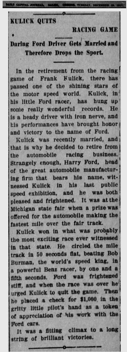 Frank Kulick would only drive one more competition, and an exhibition in 1912. A couple of months after the win over Burman and the Benz, Kulick made national headlines again: