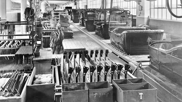 Later assembly with parts stacked on left of line, note the top irons with covered bows, then behind boxes of cut and sewn ready to fit top covers, as the body moved the top was assembled.
