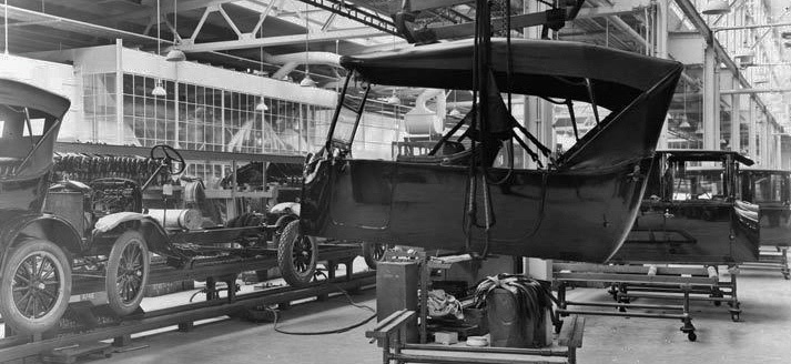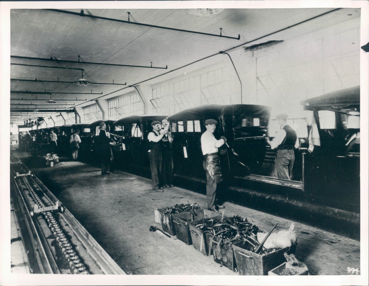 That's a good question. I suspect that it was mostly just the chassis that moved down the line and had parts added to it. Individual parts such as assembling wheels, the engine, and attaching the top to the body, would be done at stationary locations. If you remember seeing movies of the body being lowered to the chassis, the top is already on it.