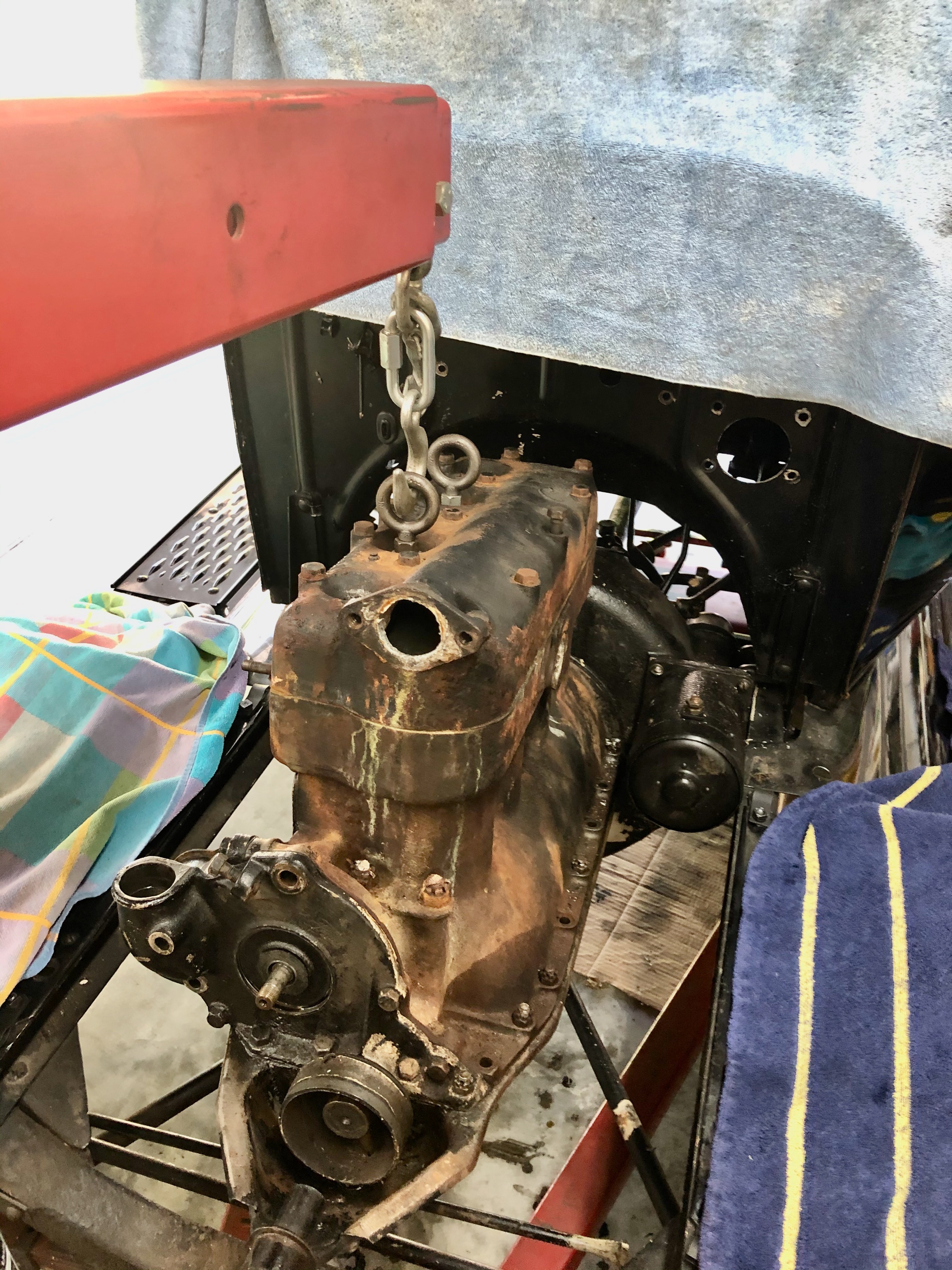 FWIW, I remove** the steering column, but not the firewall. Have the crank installed. It makes a good handle to maneuver the engine with.
