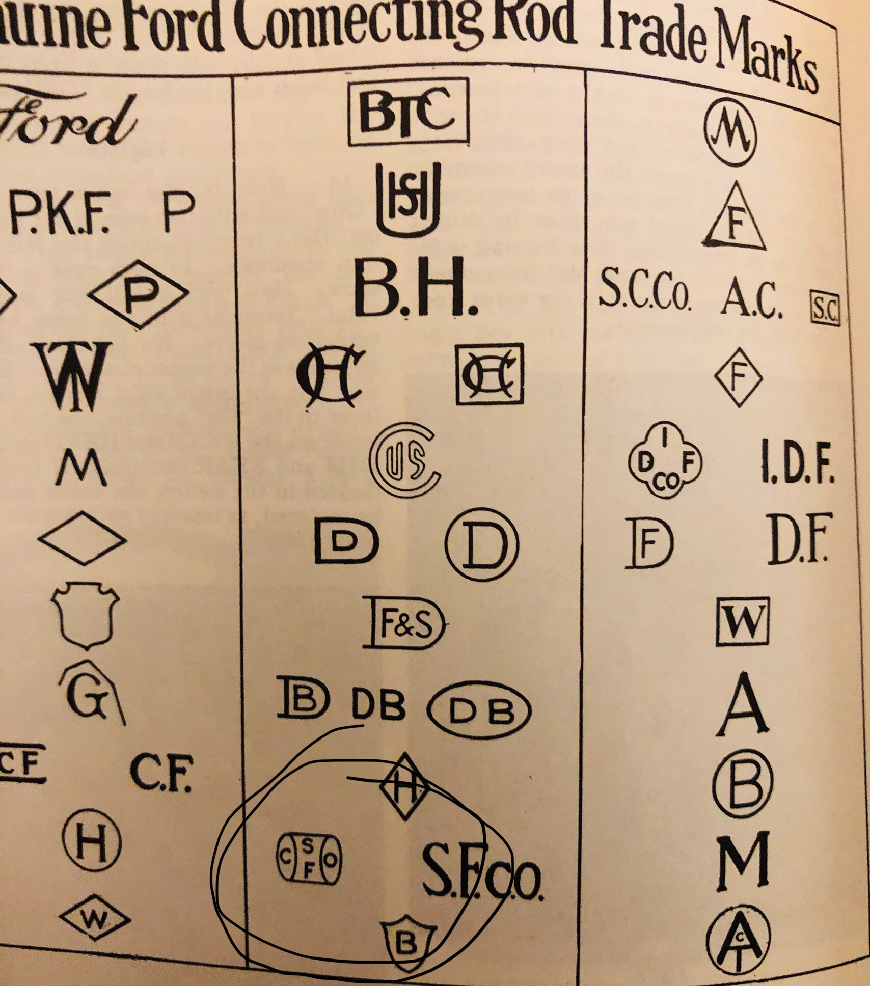You can see the S.F.Co supplier trademark at the bottom of the middle column and The Dodge Brothers mark 2 above that one. I can't remember the name for the CH logo but they did a lot of forgings for the early-28 Model A Brake system and I.D.F. made the early Pistol Grip Brake Handles for the Model A. I can't find my 1928 S.A.E. Handbook right now, but that has a suppliers section in the back that list 90 percent of these suppliers.