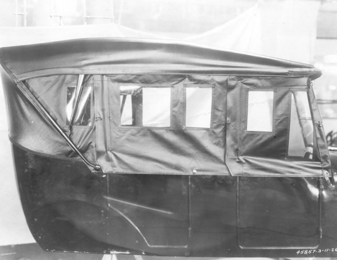 The above photo is dated 1926, the photo below is dated 1927, so maybe the pattern grew for more window area? But this 1927 photo is from Canada production, maybe Canada had bigger windows for their touring? Don't know, haven't research side curtains for the Improved Car, but might just be a change of the later T's......they did get upholstery change with pleats in the material but no buttons.