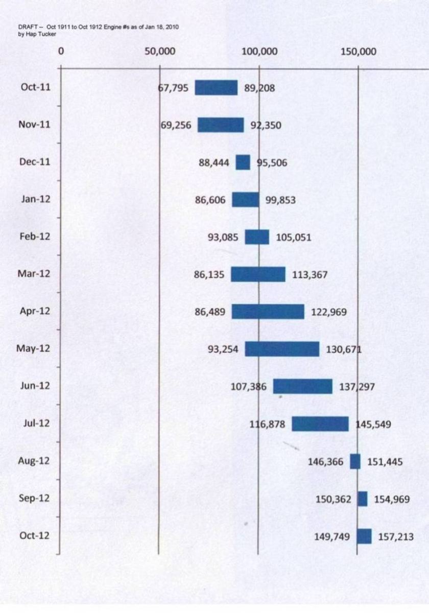 And if you look at the chart below that photo you will see that for months that if from Oct 1911 to Jul 1912 there was a wide range of overlap when the first and last engine number recorded in the Accounts Receivable ledgers had a wide range from lowest shipped number to highest shipped number in a given month. And that a given engine number could have been shipped in any of several months because of the overlap.