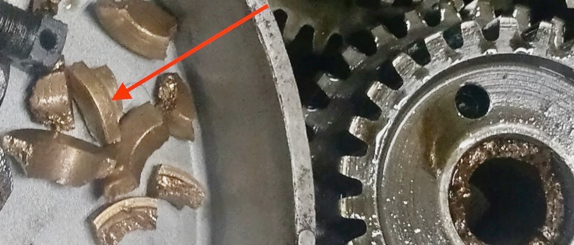 Agreed. They may also have been pressed in, in a manner that further exacerbated a poor choice of material. If the bushings were pressed in using a tool with a fairly small step with which to engage the face of the flange, after the bushing was seated against the gear face, any additional "push" would have had the effect of trying to push the flange off of the bushing. At the very least, there would have been residual tension between the flange and the bushing body that, over time & use, caused the flange to separate from a brittle Oilite bushing. The proper way to press the bushing in would have been to use a tool that covers the whole face of the bushing flange. Naturally, all of this is speculation, but it seems to support the situation now at hand.