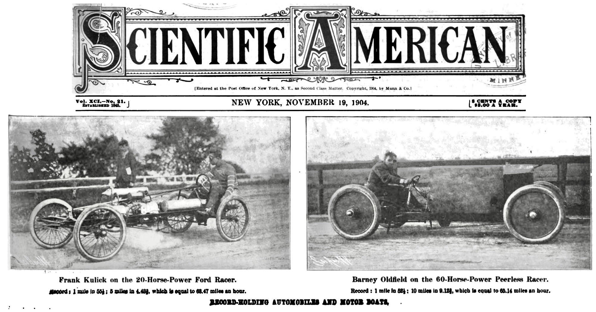 This article appeared in “Scientific American” in November 1904. Kulick driving the Ford skeleton racer and Barney Oldfield with the Peerless Green Dragon: