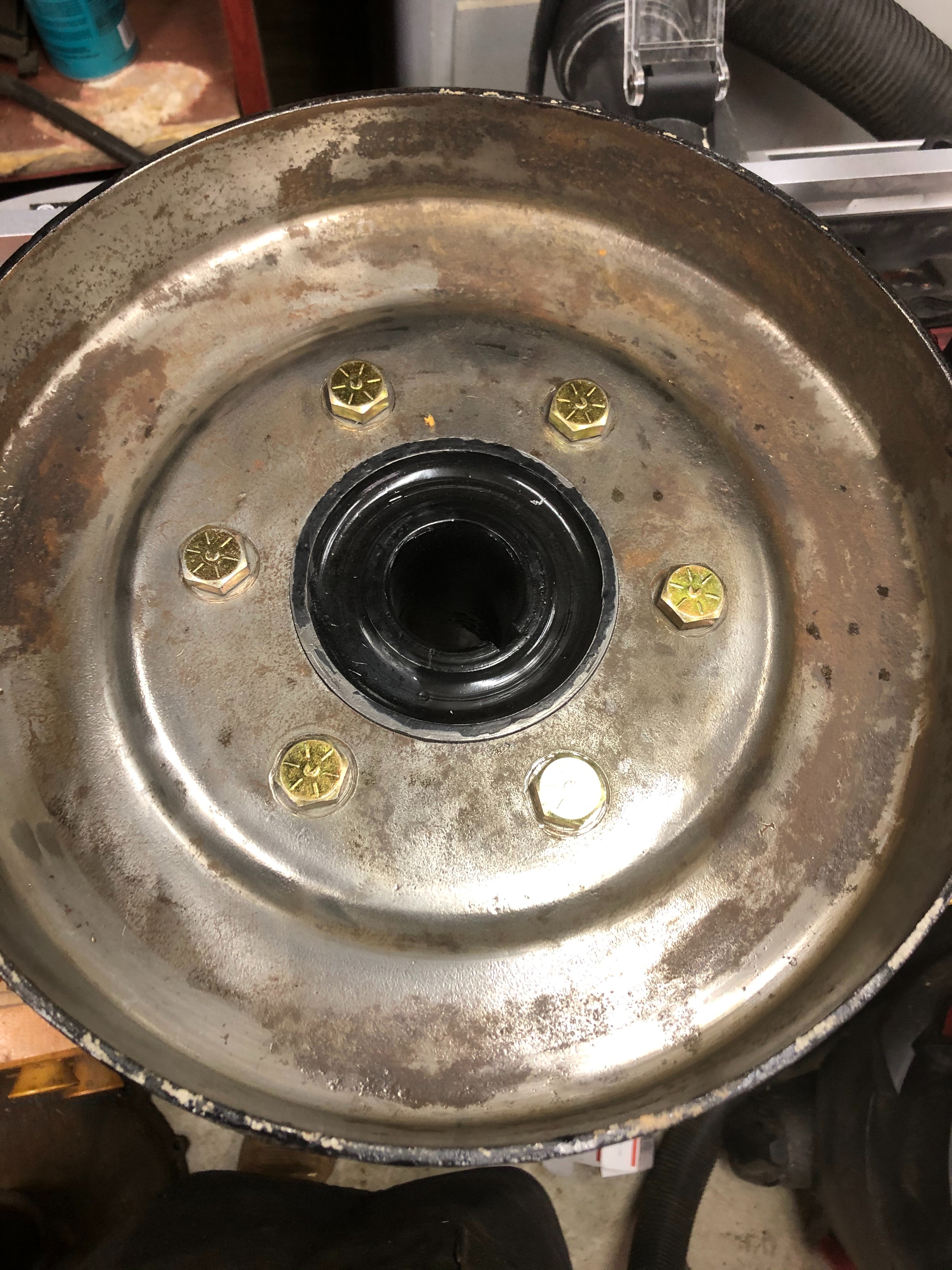 I think I’ve solve my problem that is a terrible supply of 20” TT wheel parts. When I got my 27 TT the rear wheels were in terrible shape. Namely the rims. I’m pretty sure you could read the news paper through most of the rust holes. So I thought I’d just get a better set. Now I’m positive that rims in good shape are made of unobtanium. I found a very nice set of Model A 19” wire wheels at a steal on an unrelated parts trip and then the gears started turning. I know adapters were already available for T wood hub to A wire wheel but nothing for the TT so with that information I set off on my own personal project. What it now boils down to is, with the help of my buddys machine shop, I have successfully adapted Model A wire to the TT rear hub. The A wires are a stronger wheel and 19” tires are way cheaper than their 20” counterparts. I can still get big 19” truck tires to fit the wheels but the tires that were on the wheels are very nice Firestone white walls so they’ll do for a while until I want to buy bigger tires for the rear to match. I’ve also made the plate thick enough to push the hub far enough away from the wheel to run disc brakes without interference or sacrificing structural integrity or safety. Once I’m done with the mock-up it’ll all go back together with loctite and lock washers to ensure nothing tries to come apart.