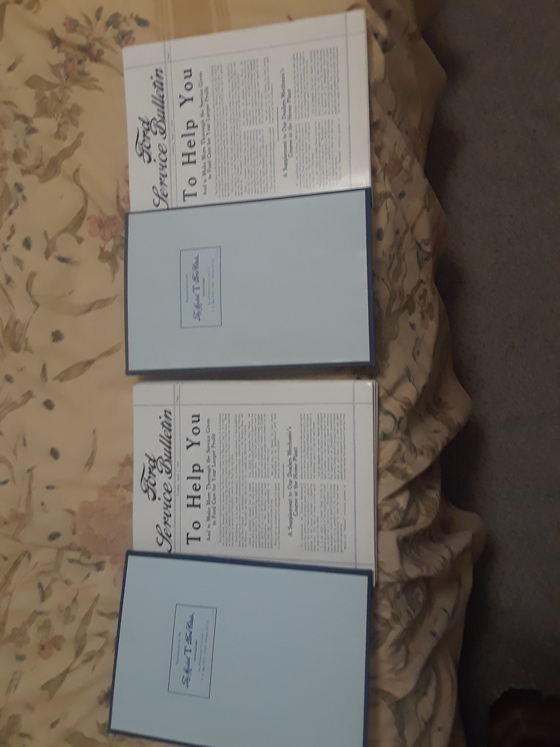 I have two sets of the reprinted Ford Service Bulletins that the MTFCI reprinted at one time. These are on fine quality glossy paper; not on a CD and both have the hard cover binder that came with them. These cover only the years 1919, 1920, 1921, and 1922, only, although I have a complete set that I could copy on my printer to complete the sets through the December 1927, but that will entail a lot of time copying at extra expense. What is a fair market value for the two sets (as is) and a complete set (if printed)?