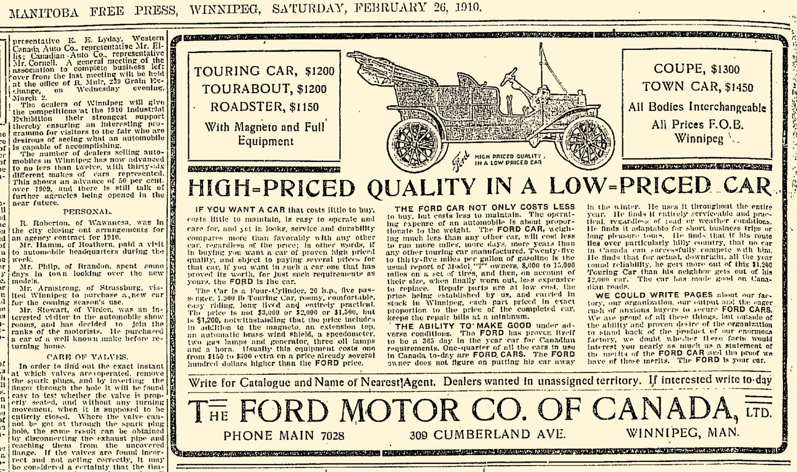 Ford advertising from Winnipeg 1909-10-11