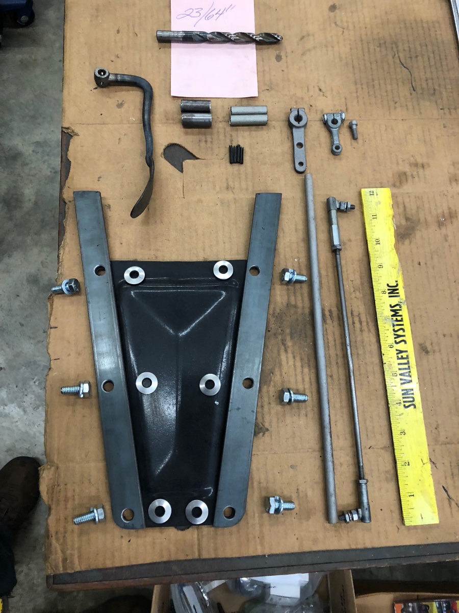 Simple list of materials from your local hardware stores; 2 feet 1/8" X 1" flat steel (cut in half) , 2 each 3/8" ID steel tubing 1 1/8" long, 13" X 5/16" round stock, 2 each 3/8" OD steel fuel tubing 1 1/2" long, 1 each old spoon gas pedal (1930's Fords, etc.) 3 each 1/8" tension/split pins 3/4" long, 1 each 12" X 3/16" round stock, some light tension pull springs. I like using self sealing washers under the mounting plate to the transmission inspection plate. Really stops any leaks. The fuel tubing is installed into the heavier tubing to act as a secondary bushing and helps in any misalignment issues and you simply just flare the ends. You will also need two ends for the hook up at carb and pedal rod, the pedal rod downward arm can be purchased from multiple vendors.