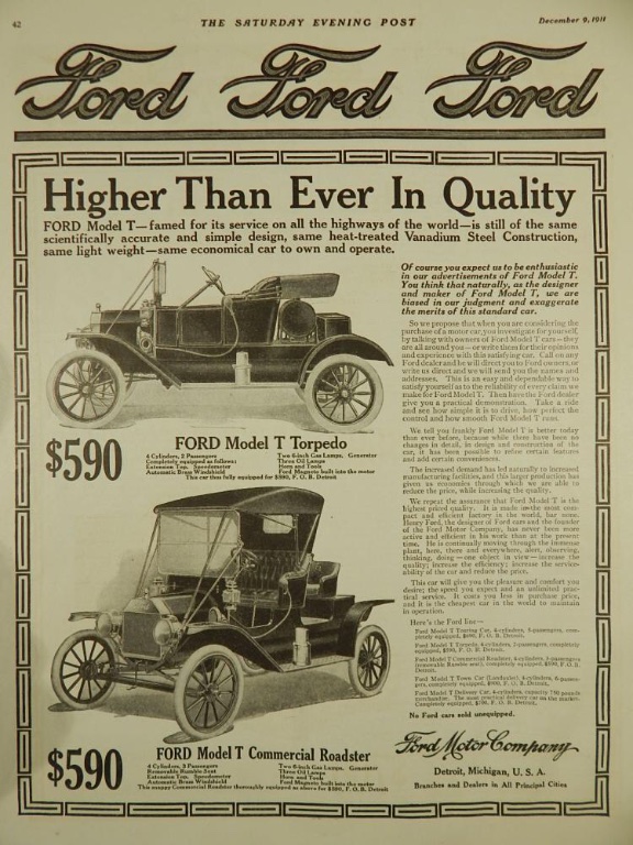 Folks at the DMV are not experts on the Model T and whether or not it is a compilation of Model T parts from several years. It looks enough like a 1911 or 1912 Model T runabout/roadster (with mother in law seat) that you can make copies of the pictures and 1911 ad I posted here and submit the pictures to the DMV and claim your T to be a 1911 or 1912 runabout since that style was offered in only those two years. If your T does not have the original engine, it should not matter. Engine change outs were common to replace worn out or blown engines and just like on modern cars whereby a new engine does not change the year of manufacture, the Model T is the same. Even if the engine has been changed out for a later engine, it does not change the manufacture year of the car. All those plaques on the dash behind the steering column may help in establishing a history of the car. Can you post a picture of those plaques? You have a great T that has the potential to be so much greater. A diamond in the rough. Jim Patrick