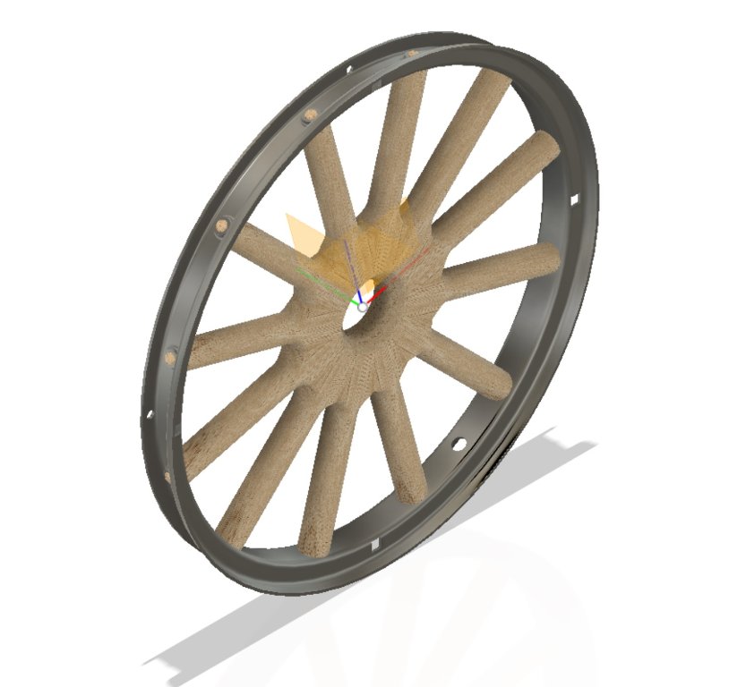 Till then I will share some screen shots of the 3D models I am building CAD. I have modeled the Ford felloe and spokes for the 30" wheels. Next will be the hub, then the rims. Then I will be able to cross section the model and share what I think is an issue with using Hayes rims on Ford felloes.