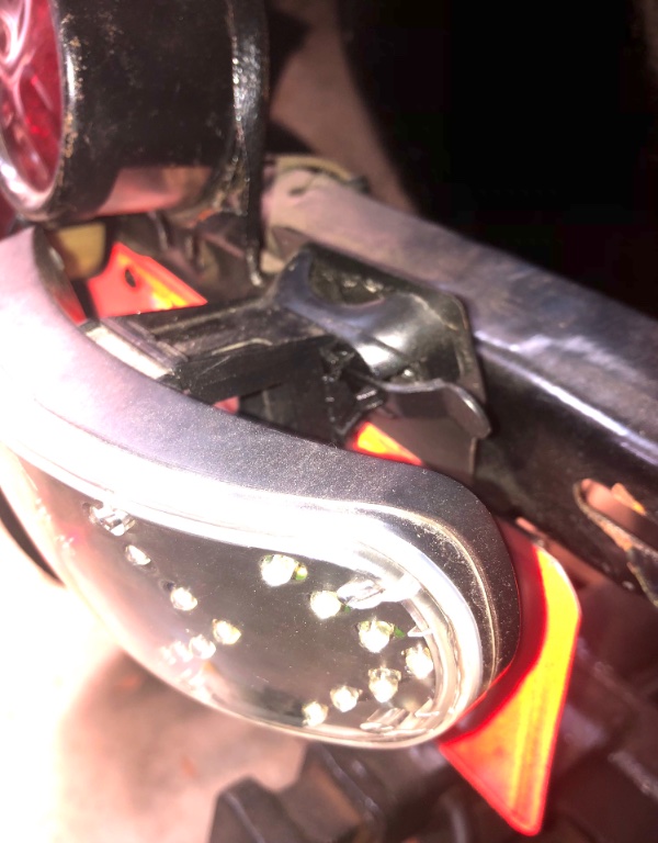 On this install of the China bicycle Signal Lamp, made a small bracket of sheet metal, bent it to present the lamp at level and marked and drilled holes to mount the sheet metal bracket to the tire carrier frame crossbar. Really not hard to make a sheet metal bracket for that plastic mount.