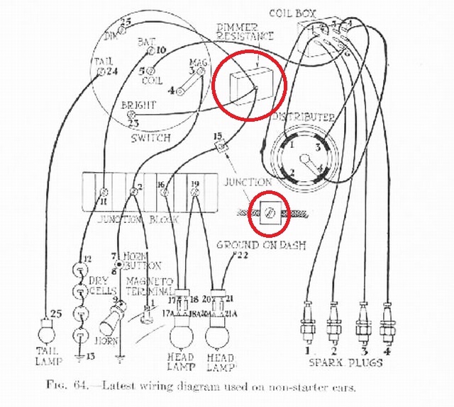 The dimmer was added in late 1917. Before that the current for headlamps went directly from mag to switch to lights to ground. The dimmer was to reduce bulb burnout, and from that you might think that bulb failure was a frequent problem, but my experience with 1915 lights is that the bulbs do eventually go, but they last a long time before they do. Of course you can make them really last if you use the 24v bulbs sold by the parts dealers, but with those you won't have enough light to see anything.
