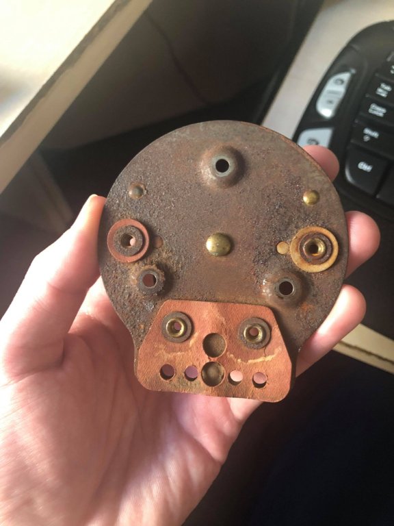 In order to properly clean this, I'm going to have to undo the rivets. However, it is incredibly unclear to me the general construction of the switch. If I were to drill from the back side, would I not damage the threads for the brass that ultimately hold the screws and the wires? And why does it look like there are two layers of rivets?