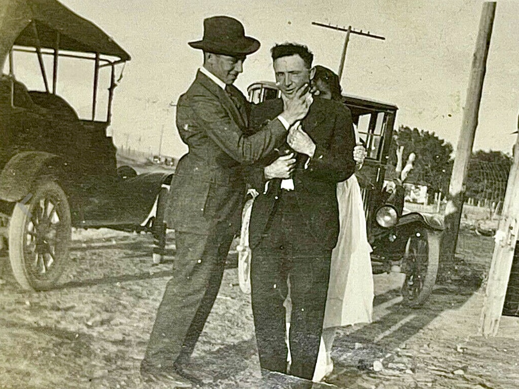 If that’s a Brownie #2, what is this called? It belonged to Lillian, my grandmother. I love the string handle, so well loved. She’s on the left here, pushing her daddy’s flivver with her sisters.