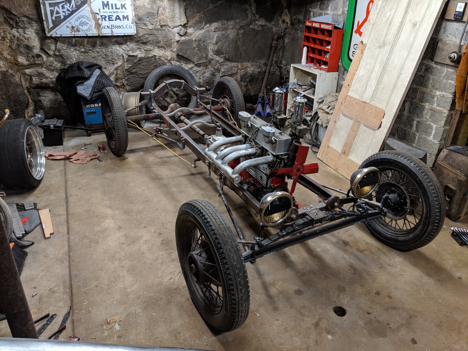 Modified T frame, Model A steering, a happy accident that it came up through the same hole in the firewall. My column will be shortened though. I am also using an A front axle complete, but used Model T spring and perches. Some mods will follow as I may add front brakes. I have the parts to do a '28 Chevy overhead on a T block.