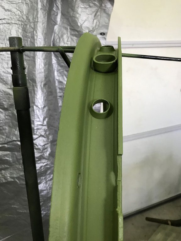 The picture is taken from a poor angle. Here is a photo of the felloe in primer. You can see a crack in one of the holes in the picture-Duh! I took it to a friend who is a master welder and he is going to weld it for me. He's going to turn down a brass rod to fit the hole to aid in welding as was described. Since I have Ford rims we're going to build up the edge a bit for strength.