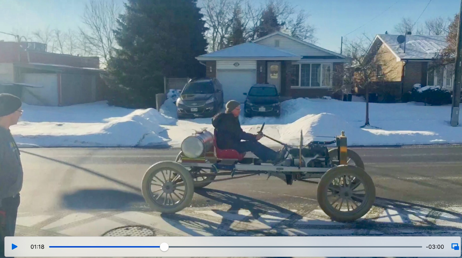 Peter and his group are sorting out the racer, this time cranking by hand and scooting up the street. If you watch the slowed down later portion of the clip you can see and hear the difference as Alan closes the auxiliary exhaust ports after the motor starts.