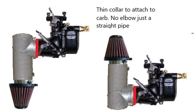 I don't know what your skill level is when it comes to fabricating is. Here is an idea, if you can find some tubing that fits snug on the carb cut a 45* as close as you can and have it still fit over the carb. turn it 180* and weld it to the 45* just cut. drill two holes and knotch to fit over the choke shaft. drill a 1/4" hole @ the top and weld a 1/4" nut to secure the tube to the carb. you can then cut the tube off long enough to clear the exhaust, or cut another 45* and turn the tube forward to get farther away. It should not be hard to find a motorcycle air filter to fit over the tube. I will try to attach