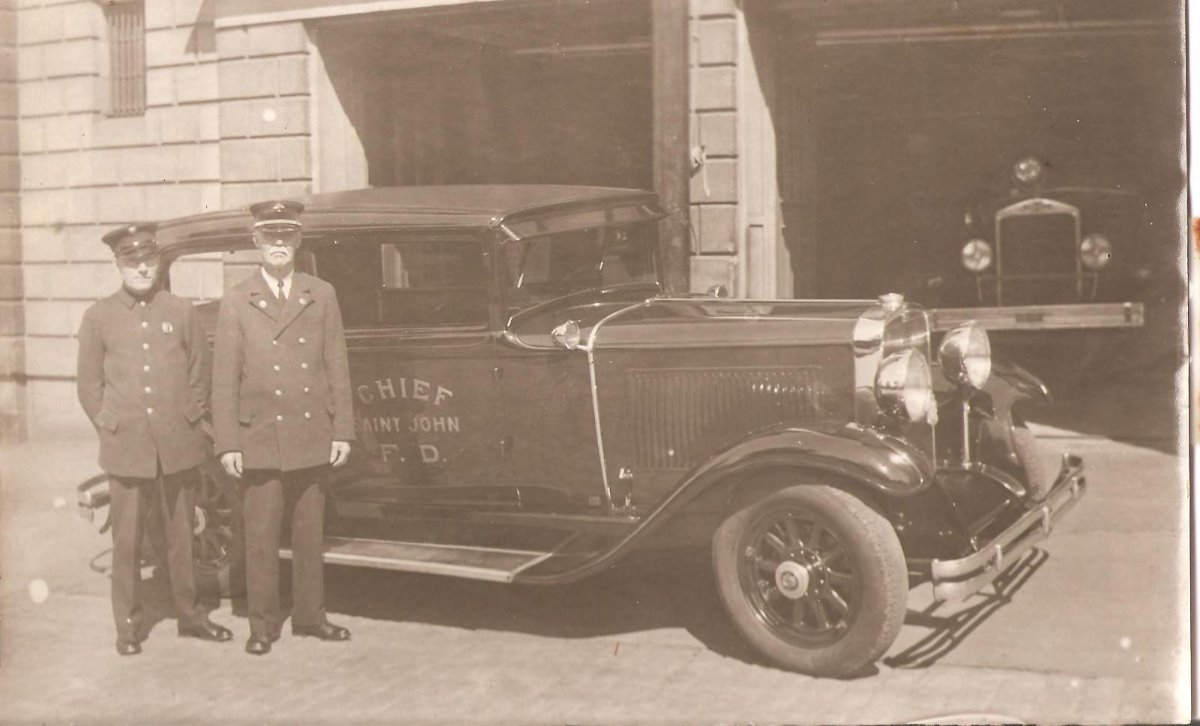 Can anyone help with id of this car and/or the fire engine in the background? The taller man is my great-grandfather who I knew after he retired from the Fire Department and lived until I was in my teens.