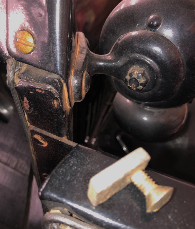 The upper nut for the oval head nickel plated screw is a square nut with lockwasher, as that one is rather easy to reach.