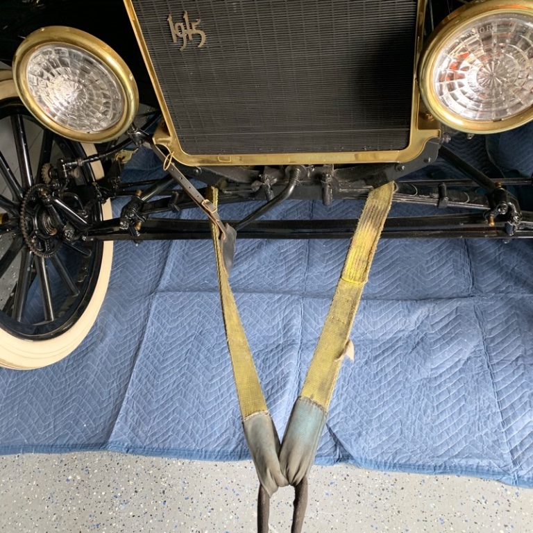 The 1913 has no radiator apron so you can feed a short strap (such as a two-foot strap with metal loops at both ends) through the gap between the radiator and the front cross member, wrap the short strap around the front frame cross member. Tie your front straps to the metal ends of the short strap, this will get your straps tied to the frame, the most secure member for such purposes.The front axle is tied to the T only by the wishbone ball and socket joint, far too weak a connection to handle the torque generated by a lurching automobile. Even wheel baskets or nets on the front are still reliant on the ball and socket joint of the wishbone, not good enough.