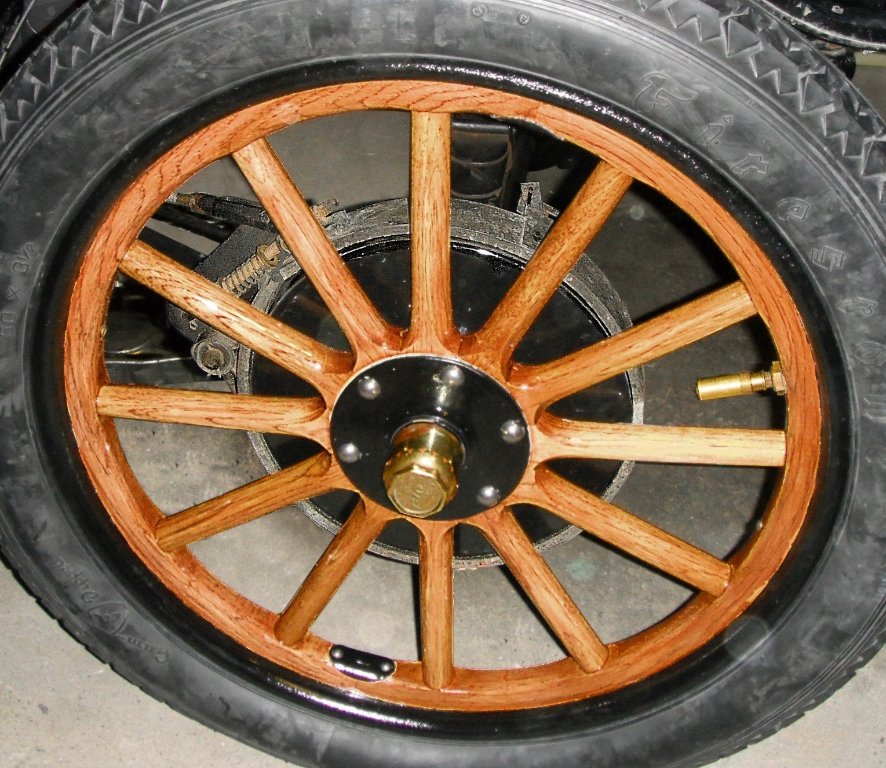 Not all the mods on my Model T were about safety and performance. As it happened, when I purchased the car, it had non-standard inner-tubes up front. These had rubber air-valve stems which, of course, looked very wrong. Rather than go to the considerable physical hassle of installing correct, metal-stem inner-tubes, I bought a couple of replica brass dust-covers to hide the rubber stems.