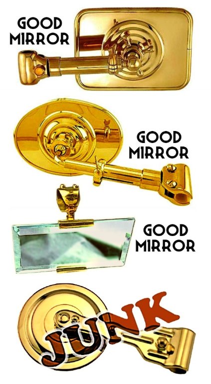 Apparently, Henry Ford was not a big proponent of rear-view mirrors, but of course, a traffic-jamming daily driver needs them. The round, brass side-view mirror with the stamped sheet-metal mounting arm—the one with which we're all familiar—is an absolutely worthless piece of junk that won't stay put and vibrates badly enough to blur the image into uselessness. I took that abomination off the car and replaced it with a pair (I like symmetry) of weighted, round mirrors—which, unfortunately, only came in black. They worked out okay and, as advertised, didn't vibrate, but just did not look right on a brass car. I wound up giving them away to someone who owned a black-steel Model T.