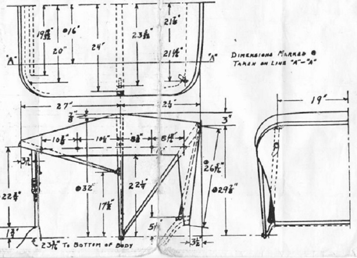 However, since a dimensioned illustration such as this could not be found showing the wood firewall, slanted lower windshield on a '14, we used the dimensions from this illustration to install the top on John VonKavarly's 1914 Roadster.