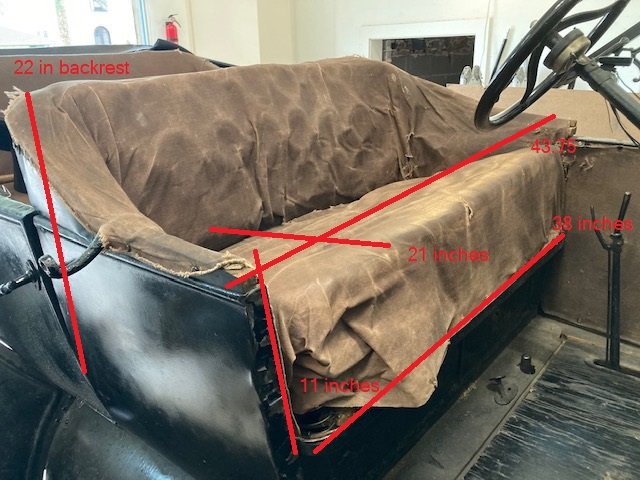 So I am still researching for a solution. I may take a field trip to Howell Sheet Metal in Beaumont but I am continuing to educate myself. For what it is worth because they are not the same I measured my 1922 Touring front seat dimensions.