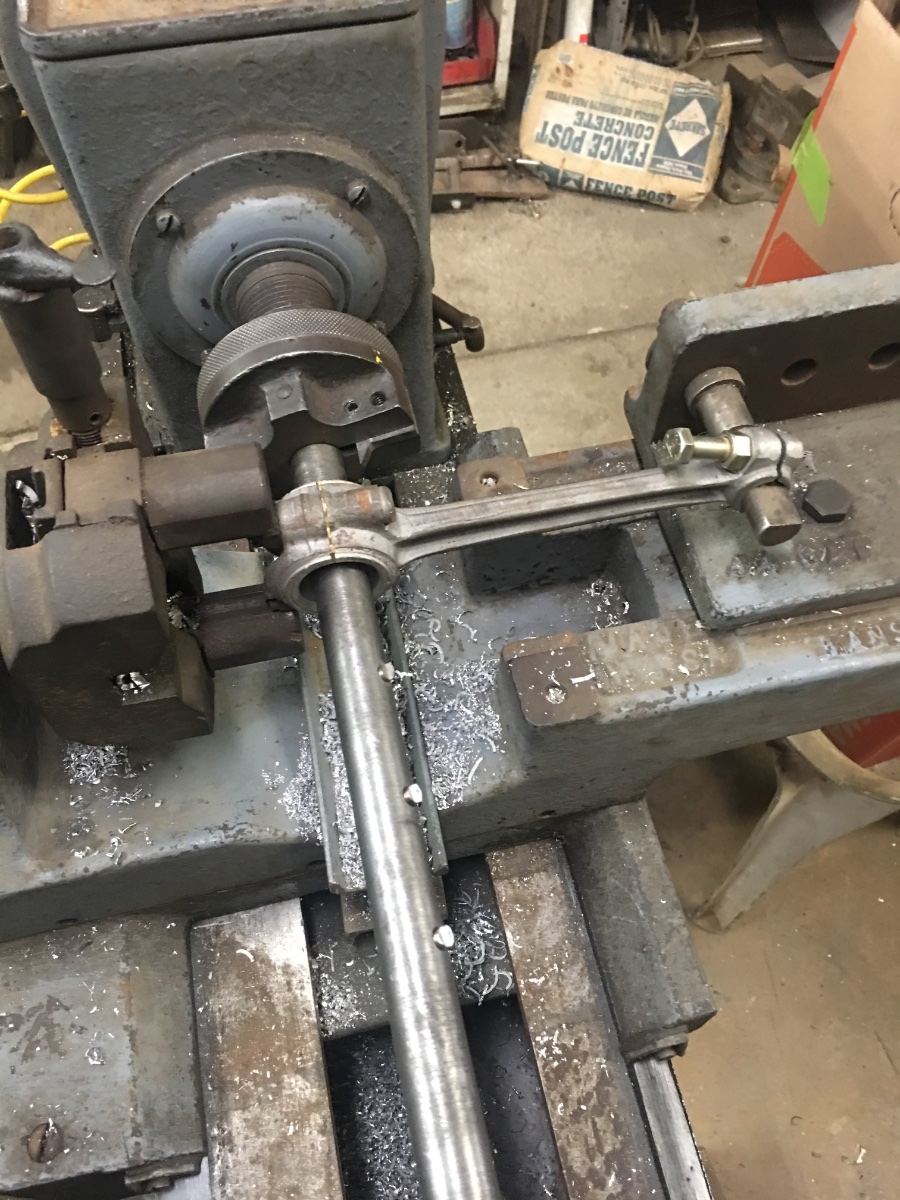 More pics were requested of my rod lathe. This machine is specifically built for that job. The machine turns the boring and the rod travels with the carriage. I have a facing tool at both ends of the bar so machining the bore and both sides of the rod can be done with one setup operation. I don't do many T rods anymore with it, there's no money in it. I have my customers buy them from the vendors. My centrifugal pouring process is too time intensive on T rods. I have done rods on this machine with over three inch journals and it has the tooling to do things as small as the tiny rods that move the sleeves in a Willys Knight engine. It can also rough or finish bore bronze bearing shells for other engines and I use it to rough bore T main caps to .050" undersized in large batches.