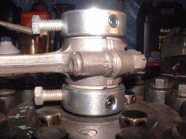 I made one like described. I used 1-1/4 ID collars above and below the connecting rod on a cut off crankshaft to keep the rod in place. Put just enough tension on the two collars to allow the rod to swing but not move up and down on the shaft. Using the rear piece of crankshaft you will need to use a spacer under it. The pins are stepped. I used a transmission shaft to fill the space. If you have a bad one, just cut the shaft part off it. Otherwise, you will need to drill a hole in your work bench for it to fit thru.