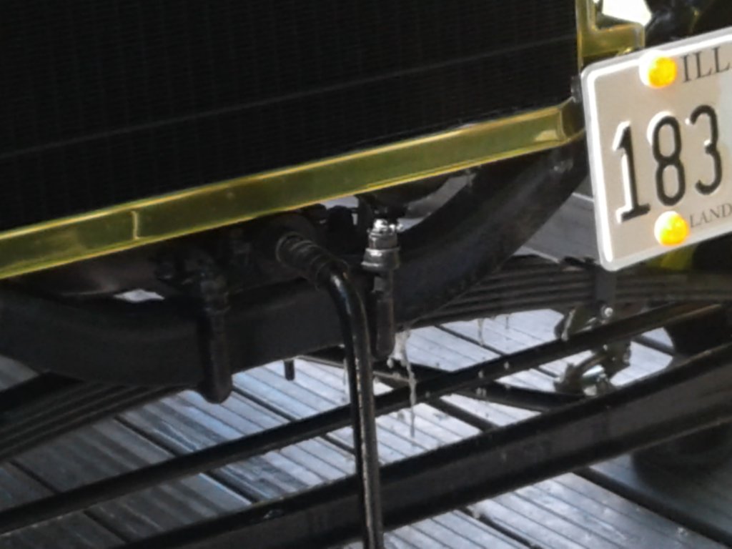 Last Saturday my local Model T club had a picnic scheduled in Crystal Lake, IL, which is about 31 miles from my house, and through some pretty congested traffic. Another member who lives about 7 miles from the picnic site, offered his yard to park trailers. So the plan was to trailer to his house and drive my T from there to the picnic. I had been having some starting issues, so Thursday before the picnic I adjusted the carburetor and it now started reliably. Friday I washed the car and touched up the brass. Saturday morning came and it was a glorious day. We arrived at our friends house, parked the trailer, and the T started right up. While still on the trailer I proceeded to put the floor boards, seat cushion, and floor mat (that I remove for towing on an open trailer) back in the car before backing off the trailer. Just as I was about to replace the floor mat, I looked at my radiator and noticed a fountain (not a trickle). Apparently my almost new radiator developed a huge leak where the core meets the bottom tank. Well so much for driving to the picnic! The good news was my T was still on the trailer, we were safe in our friends yard. If you are going to break down, in a driveway is the place to be.