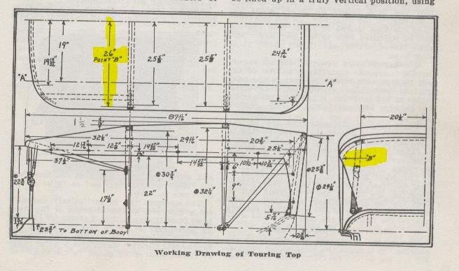 Neither the body on my 1919 touring nor the top bows on my car are original. They both were pieced together, and I did all the wood work myself, so the measurements may be slightly off. With that disclaimer out of the way: