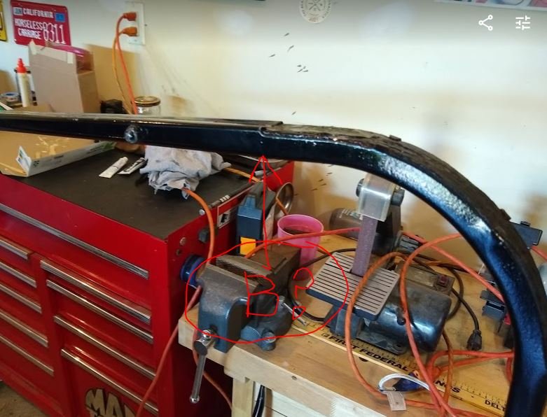 What I would really appreciate is if anyone with a 1917-1922 two man touring top car with original wood in their top bows would measure the distance between the ends of the metal portion of the metal top bows for each of the four bows, as indicated by the red dimension in re in the last picture. You can easily feel the end of the metal portion through the fabric or vinyl wrap on each bow.