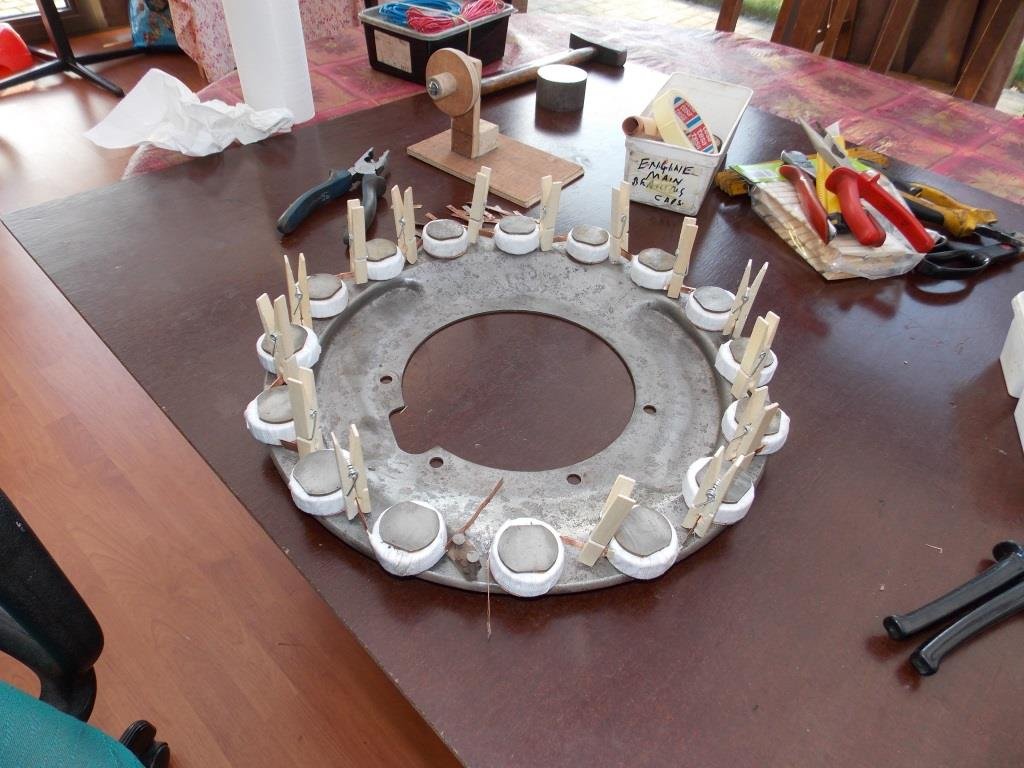Preassemble your coil ring on the support and make a loop with a 12V battery, a 21W 12V light bulb and your coil ring. As the light lights up you have continiuty. With a compass, pass near to each coil and you should find North and South alternating. When, in front of a coil, the needle do not show N or S, this coil has a problem. With the double coils the problem could be an internal short or a mistake in the assemby of the coil.