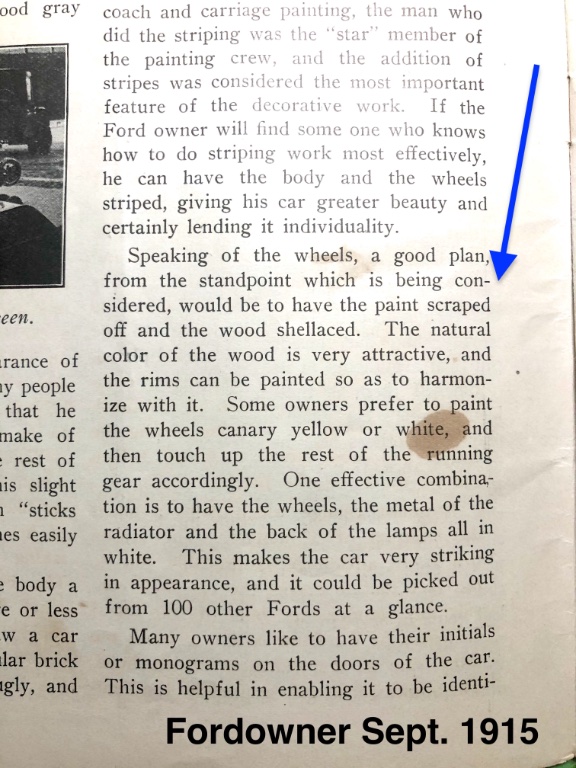 I do not consider myself a purist but do like old timey things. When I first got my T neighbors came over to look and loved the car. The spokes were black and everyone was surprised to hear they were wood. Personally I didn’t care for the painted spokes and old nickel plated caps. After stripping the paint, clear coat, a little red paint with brass caps neighbors now comment on how much better the car looks and that you can see the spokes are wood. If I had an early car with factory color, other than black, and matching wheels I might be inclined to leave them that way.